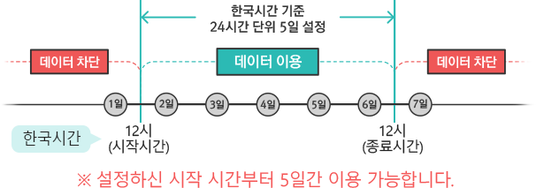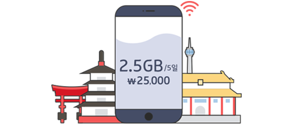 중국,일본 해외 제휴 통신사 LTE/3G 망에서 5일동안 데이터 2.5GB를 이용할 수 있는 서비스 (제공량 소진 시, 400Kbps 이하 속도로 지속 이용) |